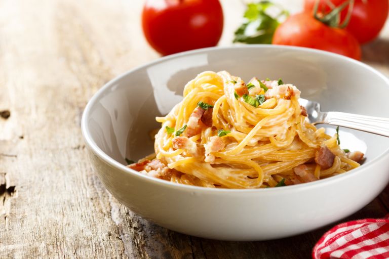 5. Εν τω μεταξύ, σε μια κατσαρόλα με ελαφρώς αλατισμένο βραστό νερό, μαγειρεύουμε τα ζυμαρικά μέχρι να μαλακώσουν στο εξωτερικό, για περίπου 3 λεπτά λιγότερο από ό, τι λέει η συσκευασία. Χρησιμοποιώντας τρυπητή κουτάλα, μεταφέρουμε τα ζυμαρικά στην σάλτσα, μαζί με 1/2 φλιτζάνι (120 ml) νερό από το μαγείρεμά τους. Στο μπολ με την πάστα από αυγά και πεκορίνο, βάζουμε ένα φλιτζάνι του τσαγιού νερό από τα βρασμένα μακαρόνια και ανακατεύουμε μέχρι να ομογενοποιηθεί το μείγμα.