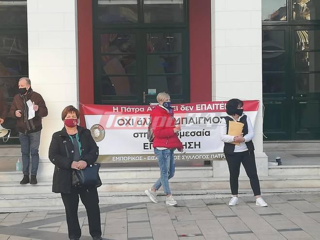 Συγκέντρωση διαμαρτυρίας πραγματοποιούν αυτήν την ώρα οι έμποροι της Πάτρας στην πλατεία Γεωργίου, για τις επιπτώσεις της πανδημίας στον κλάδο τους.