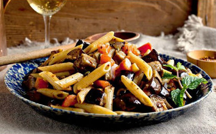 Βράζετε τις πέννες σε αλατισμένο νερό σύμφωνα με τις οδηγίες του πακέτου. Στραγγίζετε και διατηρείτε ζεστά. Στο μεταξύ ζεσταίνετε το λάδι σε φαρδύ αντικολλητικό τηγάνι. Ρίχνετε μέσα τους κύβους της μελιτζάνας μαζί με τρεις κουταλιές νερό.
