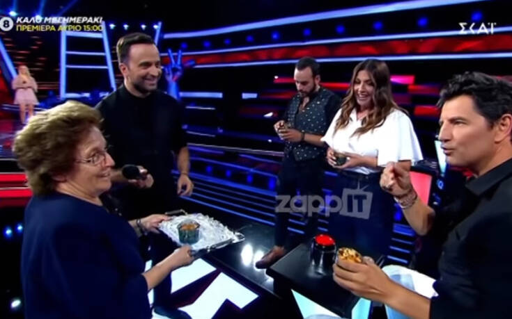 Μόλις η διαγωνιζόμενη τραγούδησε η η «σούπερ γιαγιά Κατερίνα», όπως την αποκάλεσε η Έλενα Παπαρίζου ανέβηκε στη σκηνή για να κεράσει. «Αν ήταν ζεστό θα ήταν πολύ πιο ωραίο, πάρτε κουταλάκι» τους είπε και περιέγραψε τον τρόπο που το έφτιαξε! Μάλιστα δεν δίστασε να πει ότι αν ήταν εκείνη διαγωνιζόμενη θα πήγαινε με την ομάδα του Σάκη Ρουβά!